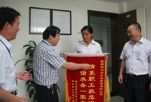 8月17日,家庭遭受火災的供水公司分公司職工莫煜君在分公司負責人及村支書的陪同下來到集團公司送上一面“情系職工救危困,和諧水務一家親”錦旗,感謝集團工會對其的幫助。