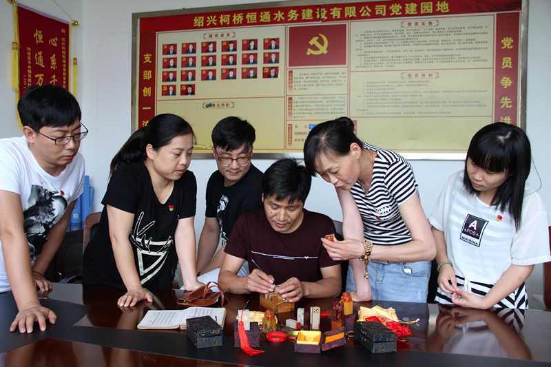 為進(jìn)一步推進(jìn)“兩學(xué)一做”學(xué)習(xí)教育,日前,恒通水務(wù)建設(shè)公司黨支部組織黨員以“黨在人民心中”為主題進(jìn)行書(shū)法、篆刻創(chuàng)作,廣泛地吸引了黨員干部參與。圖為公司職工金偉勇在向黨員們傳授篆刻的竅門(mén)。
