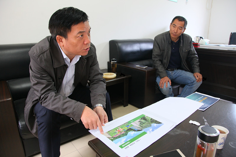 周董事長與官橋村委主任黃湯榮研究該村規(guī)劃設計方案
