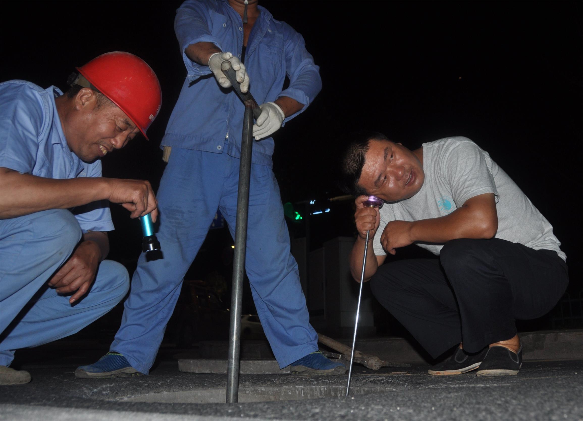 為進一步降低水量漏損,88日晚,城區分公司在前期集中“會診”的基礎上,協同管網分公司精干力量組成一支16人組成的“出診隊伍”,對柯巖南片香林大道、高爾夫路、柯巖大道和南閑路四條總管進行了夜間集中聽漏。聽診人員穿梭在夜深人靜的馬路上,用耳、用心感受“地下網”的疑難雜癥,發現可疑漏點隨即記錄筆記,并在隱患處做上標記,沒有言語交流,卻彼此配合默契。次日把“診斷報告”帶回,進行集中“會診”后再“對癥下藥”。