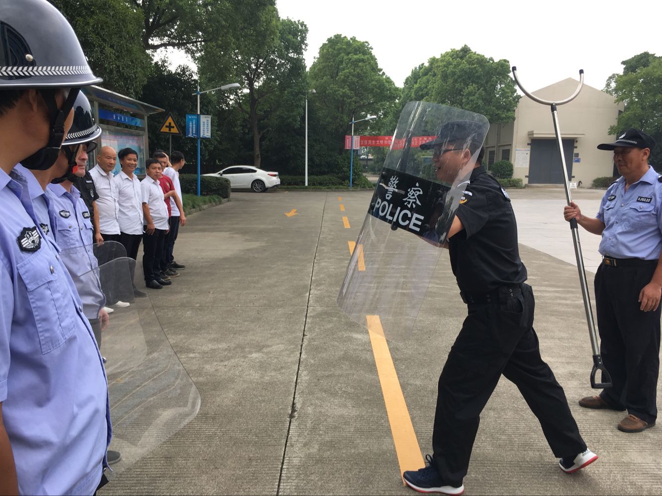 周大隊長從犯罪行為的特征分析、預防措施、實戰處置原則及方法等方面進行了全面、詳細的講解,對盾牌、鋼叉等安保器材的使用方法和技巧進行了詳細的演示和示范,并指導參訓人員進行了分組實操練習。